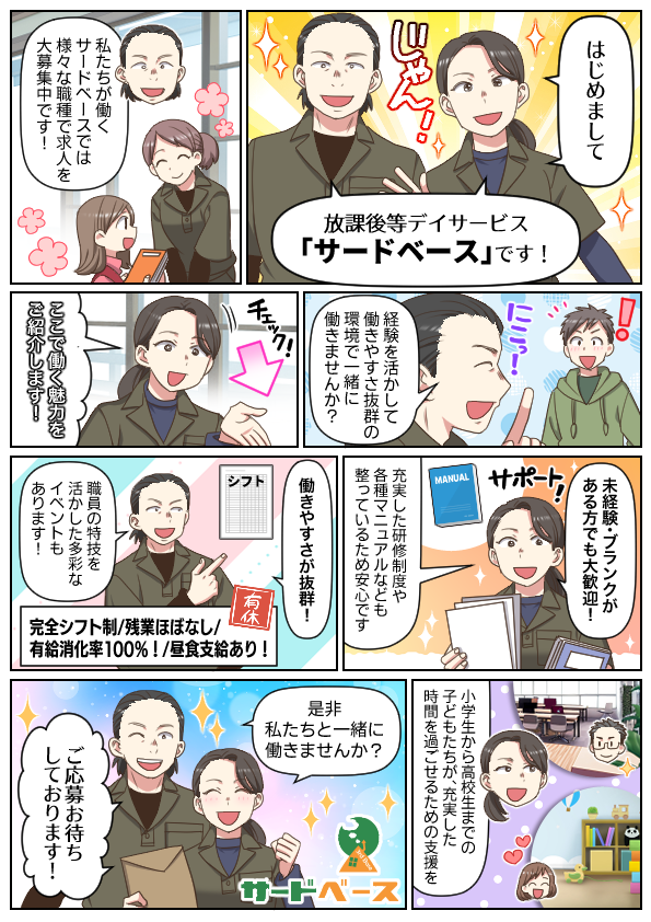 | 勤務時間 | ◎平日:10:00~19:00 ◎休日:9:00~19:00 ※長期休み等時間変動あり |